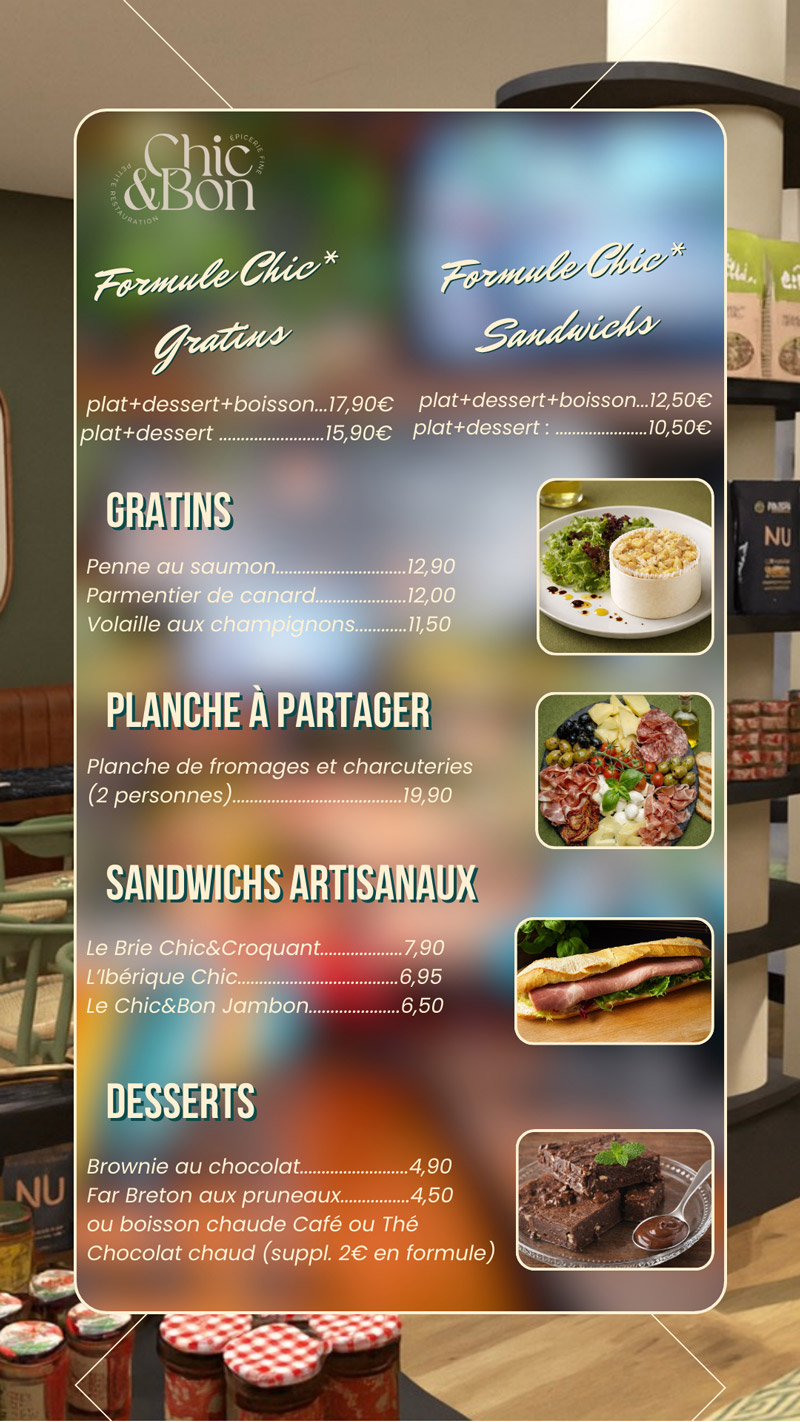 Chic & Bon propose une restauration simple, généreuse et élégante, élaborée à partir des produits de l’épicerie : sandwiches signatures, recettes de saison, brunchs authentiques, assiettes gourmandes.